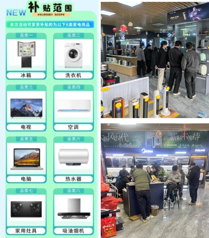 小小電器的美的專柜里,正圍滿了前來購買家電的消費(fèi)者?!靶路磕甑籽b修好了,就等著家電進(jìn)場,剛好1月1日開始實(shí)行新的‘以舊換新’補(bǔ)貼政策,還有品牌方和商場的活動(dòng),疊加滿減下來價(jià)格非常劃算?!笔忻窭钆空f。據(jù)了解,2025年政府將繼續(xù)實(shí)施家電以舊換新政策,對(duì)個(gè)人消費(fèi)者購買2級(jí)及以上能效或水效標(biāo)準(zhǔn)的冰箱洗衣機(jī)、電視、空調(diào)、電腦、熱水器、家用灶具、吸油煙機(jī)等8類家電產(chǎn)品給予“立購立減”購置補(bǔ)貼。小小電器銷售部負(fù)責(zé)人黃萍表示,1月份以來洗衣機(jī)、電冰箱以及冷柜的銷量相比上月同期增長近三成,諸如李女士趕在年前喬遷新居置辦大件家電的消費(fèi)者不在少數(shù)。