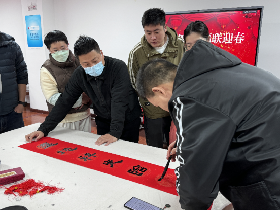 在集團(tuán)辦公樓,節(jié)日的氛圍被烘托得尤為濃厚。集團(tuán)大門口懸掛的紅綢布大燈籠,花園里的樹上同樣掛滿了聯(lián)排燈籠,如同春日暖陽。踏入大廳,玻璃門上的定制窗花、一排排紅燈籠帶著春節(jié)的熱鬧氣息撲面而來。此外,市保公司工會舉辦了“金蛇舞墨 福聯(lián)迎春”金蛇迎新書贈春聯(lián)活動?;顒蝇F(xiàn)場,紅紙鋪展,以筆為舟,以墨為海,書法家們揮毫潑墨,筆走龍蛇,一幅幅寓意吉祥的春聯(lián)和一個個飽含祝福的“?!弊周S然紙上,為即將到來的新春佳節(jié)增添了濃濃年味。